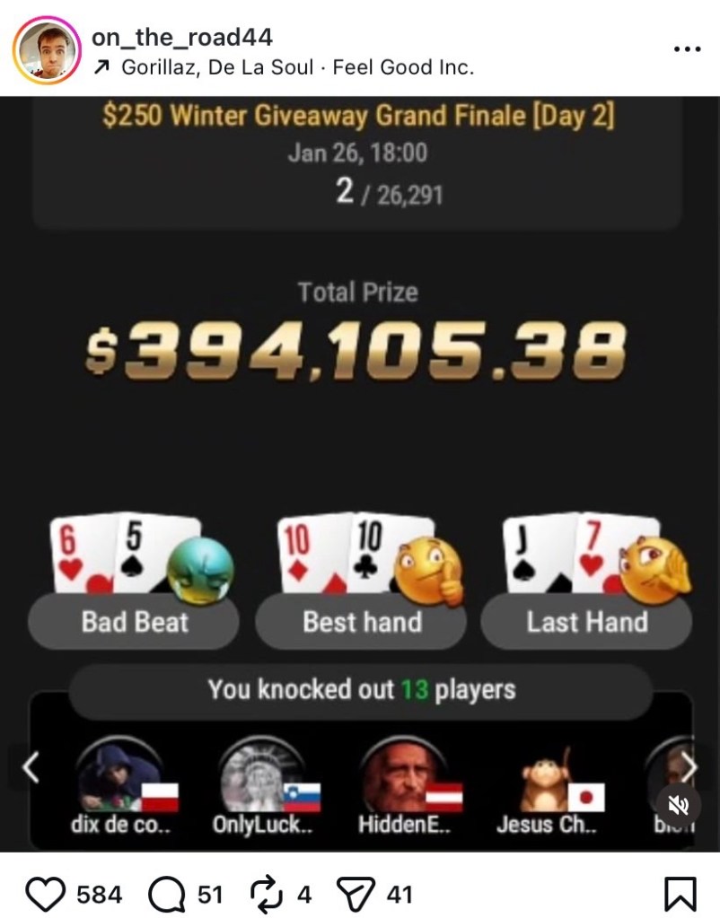Le joueur n’a d’ailleurs pas tardé à partager la bonne nouvelle sur Instagram, publiant une capture de sa performance accompagnée d’un message enthousiaste, symbole d’un lancement d’année particulièrement réussi sur les tables virtuelles.
