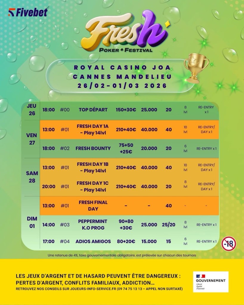 Avec ce Fresh Poker Festival, Cannes Mandelieu confirme son attractivité sur le segment des festivals mid-stakes : du poker sérieux sans se prendre trop au sérieux, dans un cadre qui donne envie de poser ses jetons… et de revenir.