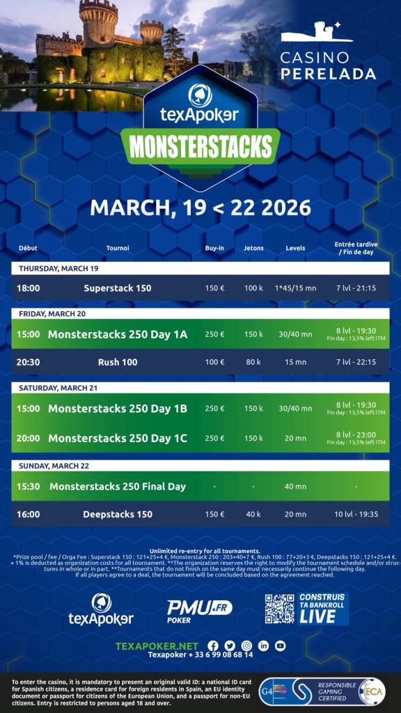Le Monsterstacks 250 s’annonce fidèle à la philosophie du circuit : gros stacks, structures confortables et vrai temps de jeu, dans une ambiance transfrontalière qui devrait séduire les habitués du Sud de la France comme les réguliers espagnols.