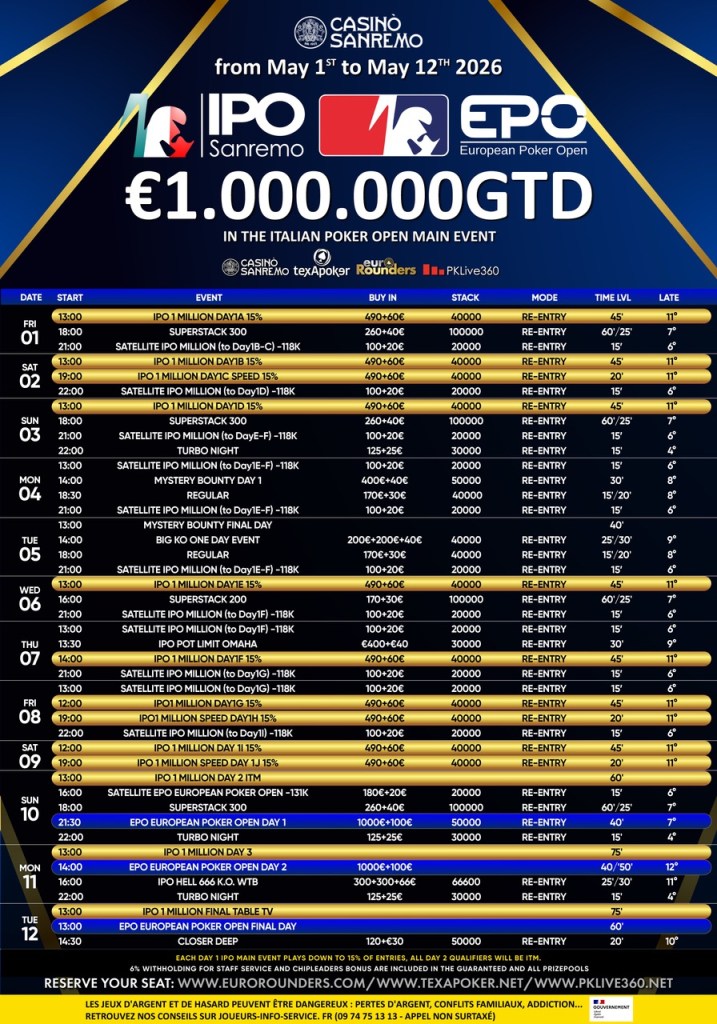 Sanremo s’apprête une nouvelle fois à redevenir la capitale européenne du poker. Du 1er au 12 mai 2026, le mythique casino italien accueillera l’Italian Poker Open, édition XXL articulée autour d’un Main Event à 550€ assorti d’un prizepool garanti de 1.000.000€. Un chiffre qui résonne déjà comme l’un des marqueurs forts du printemps live, dans une ville où l’IPO s’est bâti, année après année, une réputation de rendez-vous incontournable.