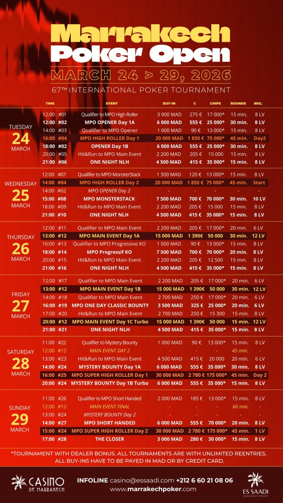 Dans un calendrier live européen de plus en plus dense, le Marrakech Poker Open prend le contrepied des festivals à rallonge. L’organisation a opté pour un format resserré sur six jours, avec un nombre de tournois volontairement limité.