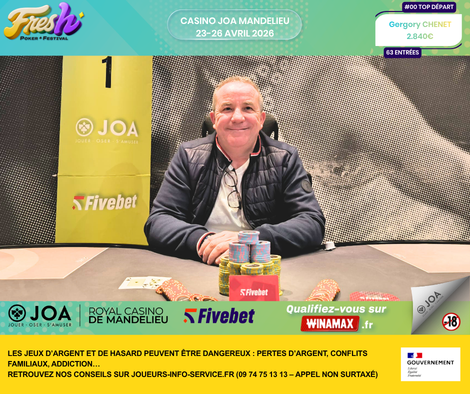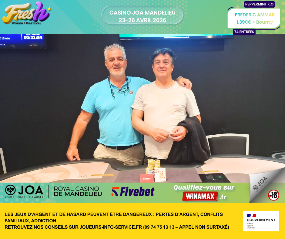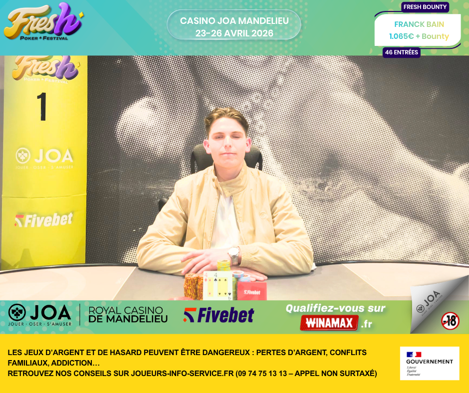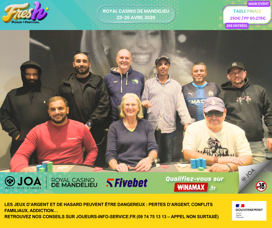 Du 23 au 26 avril 2026, le Royal Casino JOA de Mandelieu accueillait la troisième édition du Fresh Poker Festival by Fivebet. Un rendez-vous désormais bien installé dans le paysage mid-stakes français, avec une formule courte, lisible et efficace, qui continue de séduire une base de joueurs fidèle.